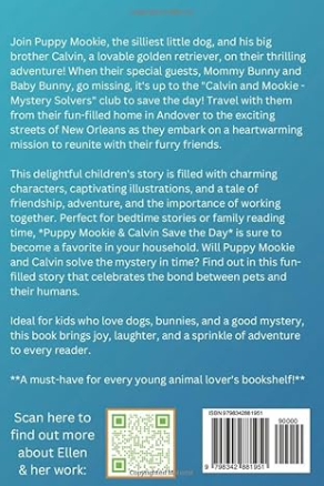 Join Puppy Mookie, the silliest little dog, and his big brother Calvin, a lovable golden retriever, on their thrilling adventure! When their special guests, Mommy Bunny and Baby Bunny, go missing, it's up to the "Calvin and Mookie - Mystery Solvers" club to save the day! Travel with them from their fun-filled home in Andover to the exciting streets of New Orleans as they embark on a heartwarming mission to reunite with their furry friends.